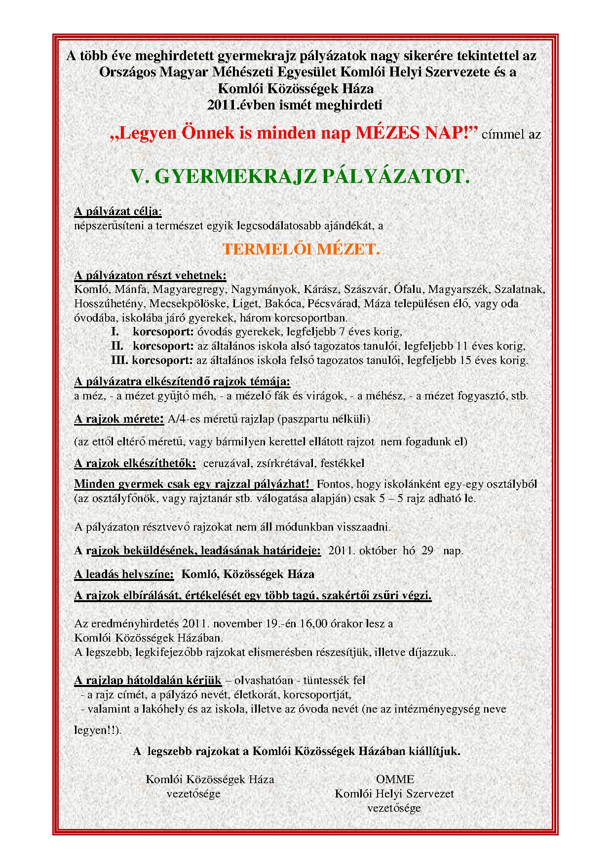 A több éve meghirdetett gyermekrajz pályázatok nagy sikerére tekintettel az Országos Magyar Méhészeti Egyesület Komlói Helyi Szervezete és a Komlói Közösségek Háza 2011. évben ismét meghirdeti „Legyen Önnek is minden nap MÉZES NAP!” címmel az V. GYERMEKRAJZ PÁLYÁZATOT.