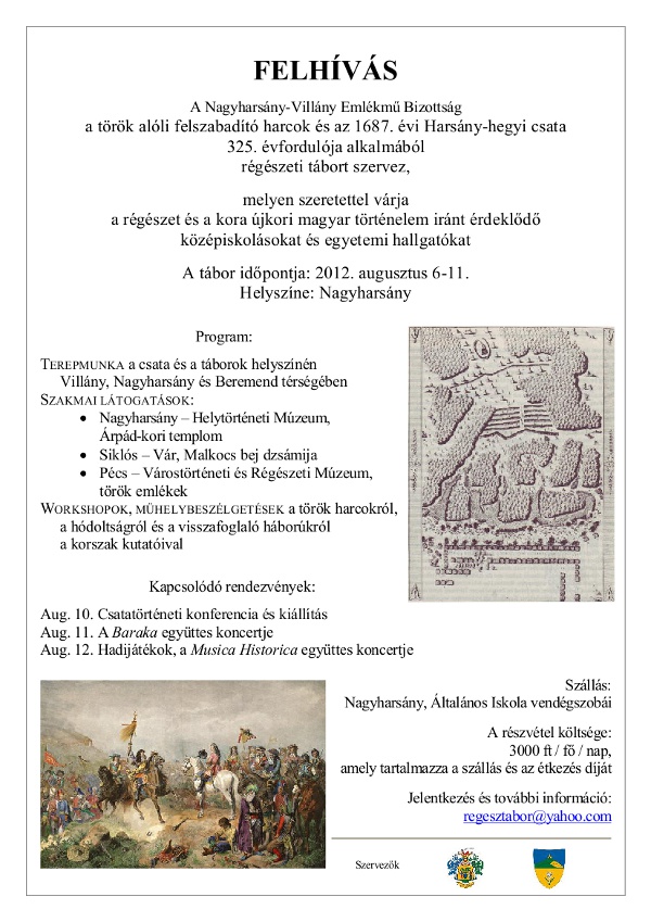 A Nagyharsány-Villány Emlékmű Bizottság a török alóli felszabadító harcok és az 1687. évi Harsány-hegyi csata 325. évfordulója alkalmából régészeti tábort szervez,