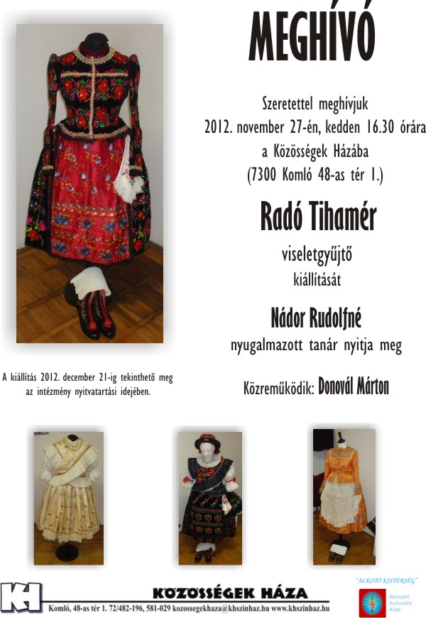 Kiállítás Radó Tihamér viseletgyűjtő egyedülálló gyüjteményéből, Hoszúhetény és környéke csodálatos viseleteiből.