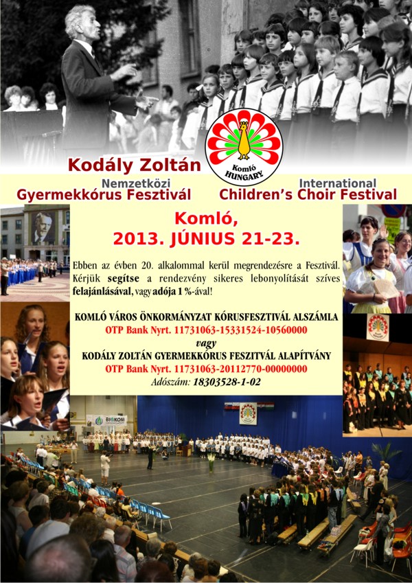 Kérjük segítse a XX. Kodály Zoltán Nemzetközi Gyermek Kórusfesztivál sikeres lebonyolítását szíves felajánlásával, vagy adója 1 %-ával.