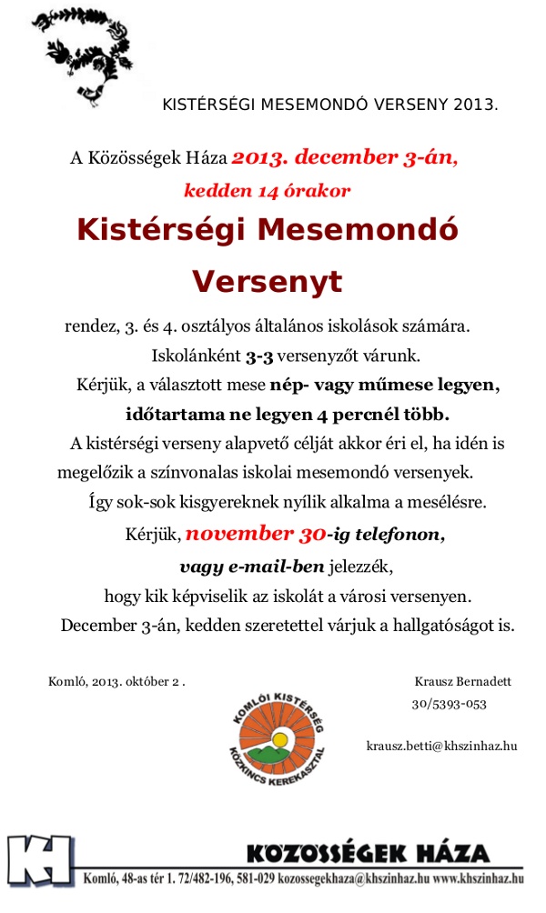 A Közösségek Háza 2013. december 3-án, kedden 14 órakor Kistérségi Mesemondó Versenyt rendez, 3. és 4. osztályos általános iskolások számára.