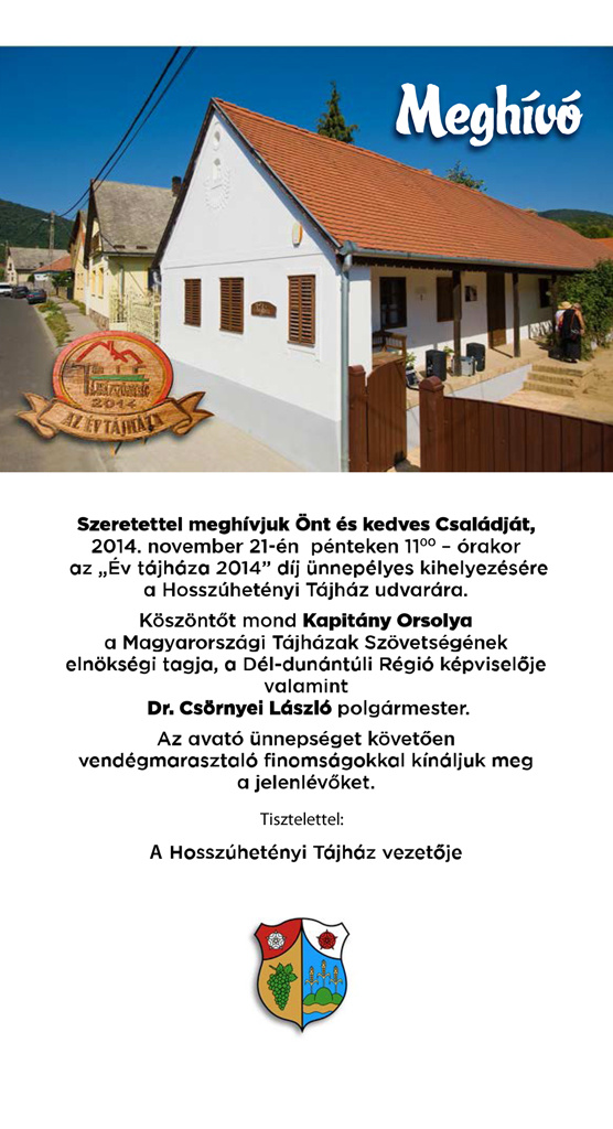 A Magyarországi Tájházak Szövetsége az a Hosszúhetényi Tájháznak adományozta az "Év Tájháza" címet, amelynek ünnepélyes kihelyezésére invitálja az érdeklődőket a Tájház vezetője.