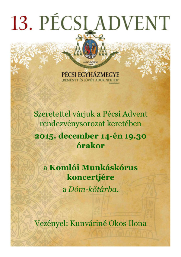 2015. december 14-én a Komlói Munkáskórus a Dóm-kőtárban énekel a 13. Pécsi Advent rendezvénysorozatban.
