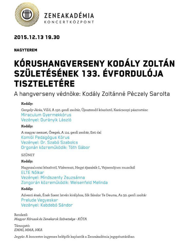 2015. december 13-án a Komlói Pedagógus Kamarakórus Kodály Zoltán születésének 133. évfordulójának tiszteletére rendezett kórushangversenyen énekel a Zeneakadémián.
